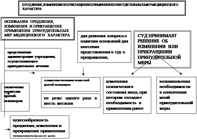 В случае изменения психического состояния лица, подвергнутого принудительным мерам медицинского характера суд по представлению администрации учреждения, осуществляющего принудительное лечение, может изменить вид принудительной меры, прекратить лечение или, напротив, продлить его. Базой судебного решения является заключение врачей-психиатров, прогнозирующих поведение лица в случае изменения вида принудительной меры медицинского характера либо прекращения ее исполнения.