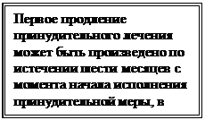 Сроки, в течение которых субъект проходит обязательное лечение, не установлены ни законом, ни иным подзаконным актом. Они зависят исключительно от достижения целей, стоящих перед принудительными мерами медицинского характера — излечение или такое улучшение психического состояния лица, в результате которого оно становится не опасен для себя и окружающих. Пока цели медицинского вмешательства не достигнуты, лицо содержится на условиях больничного режима. Однако, для того чтобы сохранить объективность и исключить возможность злоупотреблений применением принудительных мер медицинского характера, в ч. 2 ст. 102 УК установлен императив, согласно которому лицо, содержащееся под наблюдением врача-психиатра, подлежит освидетельствованию компетентной врачебной комиссией не реже одного раза в шесть месяцев для решения вопроса о наличии оснований его дальнейшего содержания в соответствующем учреждении. На основании решения комиссии суд может изменить меру содержания, прекратить исполнение принудительной меры медицинского характера или продлить время ее исполнения. Первое продление принудительного лечения может быть произведено по истечении шести месяцев с момента начала лечения, в последующем продление принудительного лечения производится ежегодно.