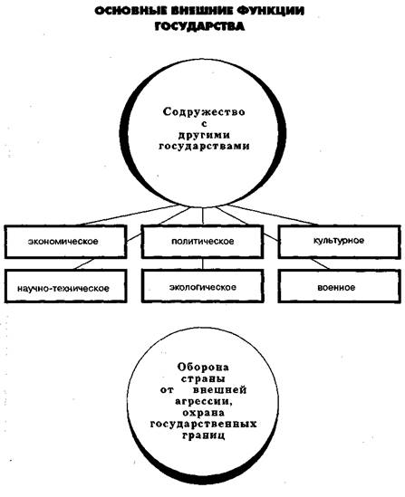 Внешние функции государства представляют собой основные направления его деятельности на международной арене.Они призваны решать следующие внешние задачи государства: установление и поддержание нормальных отношений с другими государствами и обеспечение обороны страны от возможной внешней агрессии. В соответствии с указанными задачами различаются две основные внешние функции государства: взаимовыгодное сотрудничество со всеми другими государствами мирового сообщества и оборона страны от нападения извне. (См.: приложение № 3)
