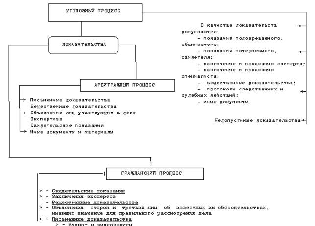 Правила о доказательствах и доказывании сосредоточены преимущественно в соответствующих процессуальных кодексах, причем есть немало одинаковых по содержанию норм, применяемых в различных видах судопроизводства. Черты сходства особенно доминируют при сопоставлении положений о доказательствах и доказывании в Гражданском процессуальном кодексе РФ (ГПК), УПК РФ и в Арбитражном процессуальном кодексе РФ (АПК). Это естественно, если исходить из природы дел, рассматриваемых судами общей юрисдикции и арбитражными судами.