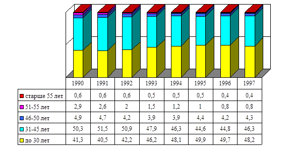 Анализ статистических данных показывает, что если в период 1995-1997 гг. рост дисциплинарных проступков и преступлений среди личного состава был непосредственно связан с расширением рядов ОВД, то сегодня это происходит скорее за счет размывания профессионального ядра. Кадровые реформы последних лет обозначили явную тенденцию к омоложению личного состава, что не может быть оценено однозначно положительно (рисунок 1). Обновление кадров, сопровождающееся уменьшением удельного веса опытных сотрудников, ведет к снижению общего профессионального уровня и повышению риска криминализации личного состава, на что обращают внимание и российские исследователи [10, c.175].