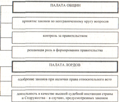 Первая группа обеспечивает участие палаты в законодательном процессе (рассмотрение в соответствии с процедурой вносимых законопроектов — биллей, исключением здесь является особое требование для внесения финансовых биллей, которые вносятся лишь в Палату общин; внесение поправок в законопроекты, принятые нижней палатой, и т. д.). Вторая группа полномочий главным образом заключается в контроле над работой Правительства. Судебные полномочия Палаты значительны и определяются тем, что она является высшей судебной инстанцией Великобритании. Однако в 2003 г. создано новое министерство по конституционным делам, которое должно взять на себя большинство полномочий Лорд-канцлера, в том числе в судебной сфере. Нижняя палата — Палата общин — единственный выборный центральный орган государственной власти. Только депутаты этой Палаты могут именоваться членами Парламента. Численный состав Палаты — 659 членов, избираемых, сроком на пять лет. Палата может быть распущена монархом. Палату общин возглавляет спикер. Данная ответственная должность существует с 1377 г.