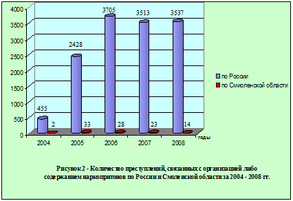 Как уже отмечалось, несмотря на сокращение количества преступлений в сфере незаконного оборота наркотиков, их доля в структуре преступности имеет тенденцию к увеличению. В 2008 году выявлено свыше 97636 наркопреступлений (на 68,7 % больше, чем в 2004 году). Из указанного количества 45620 преступлений (46,7% от общего количество преступлений в сфере незаконного оборота наркотических средств и психотропных веществ в 2008 году) квалифицируются в соответствии с УК РФ как тяжкие и особо тяжкие. По Смоленской области за 2008 год было зарегистрировано 927 преступлений против уровня 2004 года, когда было зарегистрировано только 773 преступления. Причем более 54,4 % квалифицируются как тяжкие и особо тяжкие. Раскрыто более 12 тыс. наркопреступлений, совершенных преступными группами, в том числе свыше 143 по Смоленской области.