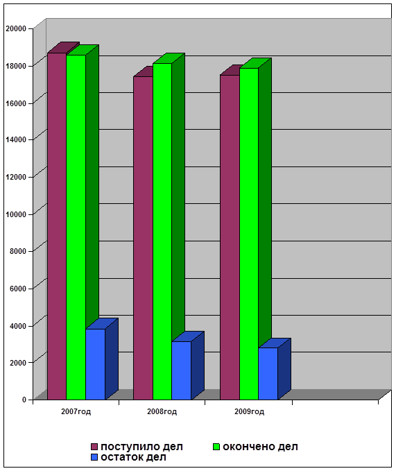 Данный тезис подтверждается материалами судебной практики. Так в районные суды Новосибирской области в 2009 году поступило 17503 уголовных дела (против 17434 дел за тот же период в 2008 году и 18727 дел в 2007году). Количество оконченных дел составило в 2009году 17885дел , 2008 году-18140 дел, в 2007году-18600 дел (см. приложение А).