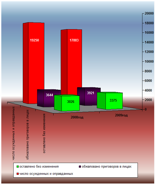 Если оценивать законность и обоснованность приговора по результатам их обжалования, либо опротестования в кассационном или надзорном порядке, то положение в целом продолжает ухудшаться. Если в 2008 году были обжалованы и опротестованы приговора в отношении 3644 лиц, то в 2009 году в отношении 3921лица (см. приложение Б, В).