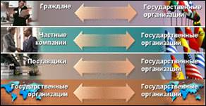Используя новые технологии, свойственные информационному веку, - в особенности Интернет, - государство имеет беспрецедентную возможность реформировать вертикальную структуру власти и начать предоставлять интегрированные, комплексные услуги для улучшения взаимоотношений и развития связей между государственными службами и гражданами (G2C - government-to-citizen), государством и частными компаниями (G2B - government-to-business), государственными организациями и их сотрудниками (G2E - government-to-employee), а также между различными государственными органами и уровнями государственного управления (G2G - government-to-government) в соответствии с рис.1.