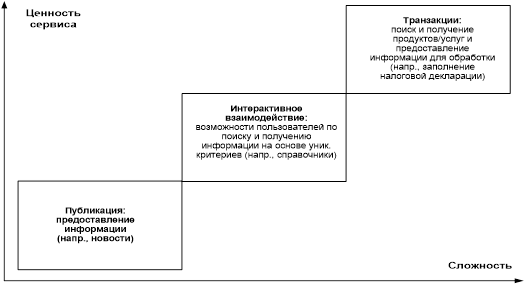 Однако если смотреть в будущее - на несколько лет вперед, - то реализация определенных интерактивных услуг, и тем более транзакционных услуг, потенциально может принести реальную дополнительную пользу гражданам в виде экономии времени, затрачиваемого на взаимодействие с государством. [20, c.16] Польза для государства будет состоять не только в повышении качества обслуживания граждан, но и в экономии средств, которые расходуются на такое обслуживание. В результате обе стороны выигрывают от такого взаимодействия - особенно, если рассматривать порталы в контексте всего спектра каналов взаимодействия государства с гражданами. Более интерактивные услуги потенциально несут не только бóльшую ценность, но и бóльшую технологическую сложность, как показано на рис.2.