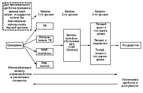 Многие частные компании выбирают модель, в соответствии с которой используются центры телефонного обслуживания (call centers), но при этом они присутствуют как вторичный канал. С точки зрения повышения удобства и уменьшения затрат на обслуживание запросов граждан и бизнеса, государству было бы выгодно, чтобы его клиенты в максимальной степени пользовались каналами взаимодействия 1-го уровня (т.е. доступ к порталу с помощью персональных компьютеров, информационных киосков и пр) и только уже потом использовали другие каналы взаимодействия, такие как центры телефонного обслуживания или личные визиты в государственные организации.