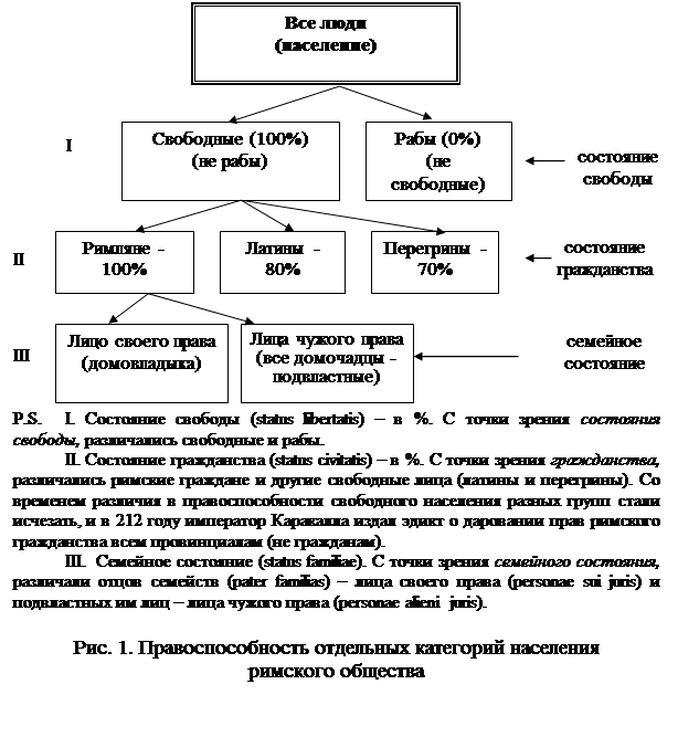 Для физического лица быть правоспособным значило обладание тремя статусами: свободы (statuslibertatis), гражданства (statuscivitatis) и семейным статусом (statusfamiliae). Лишь свободный, римский гражданин, свободный от власти домовладыки, обладал полным объемом прав и обязанностей в сфере имущественных и обязательственных отношений (juscommercii). Только при наличии всех трех статусов возникала полная правоспособность. Утрата одного из них влекла за собой прекращение правоспособности либо изменение ее содержания. Правоспособность отдельных категорий населения римского общества схематично представлена на рис.1.