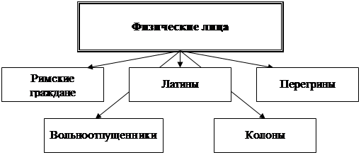 ОТДЕЛЬНЫЕ КАТЕГОРИИ НАСЕЛЕНИЯ. К ним относились: свободные, а потому полноправные римские граждане (о них мы вели речь выше), латины, перегрины, рабы, вольноотпущенные, колоны. Схематично физические лица – субъекты гражданского права (исключая рабов) – представлены на рис. 3.