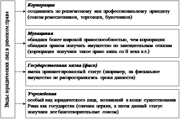 Вместе с тем правовое регулирование и доктринальная разработка института юридического лица в Древнем Риме находились в зачаточном состоянии. Неполнота и непоследовательность конструирования института юридического лица в Древнем Риме объясняются вполне определенными социально-экономическими причинами: в ту историческую эпоху они играли неизмеримо меньшую роль, нежели индивидуальные субъекты, поэтому не им, а индивидуальным субъектам как центральной фигуре древнего общества и было уделено главное внимание в нормах и доктрине частного права.