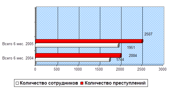 Диаграмма 1. Количество сотрудников и преступлений, совершенных ими за 6 месяцев 2004 и аналогичный период 2005 гг.