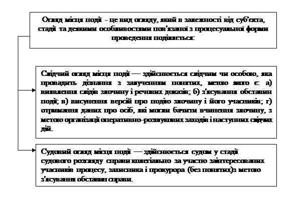 Одним із найбільш складних видів огляду є огляд місця події. Під місцем події розуміється приміщення або місцевість, де вчинено злочин або де є матеріальні сліди, пов'язані з подією злочину. Місце злочину і місце події — поняття, які не завжди співпадають: місце події— поняття більш широке, бо воно пов'язане з виявленням ознак, що мають відношення до події злочину; місце злочину - це місце безпосереднього вчинення злочинного наміру, яке спричинило певні матеріальні зміни (наявність слідів злому, взуття, крові та ін.).