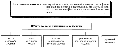 З позицій кримінології, поняття "насильницька злочинність" є теоретично обґрунтованим. В основі об'єднання зазначених діянь в окрему кримінологічне значиму групу лежать такі критерії: 1) об'єкт посягання – суспільні відносини, що охороняються кримінальним законом, які забезпечують недоторканність фізичного статусу особи; 2) форма вини – прямий умисел; 3) спосіб дій злочинця – фізичне або психічне насильство; 4) насильство відбувається проти волі потерпілого [13, 256].