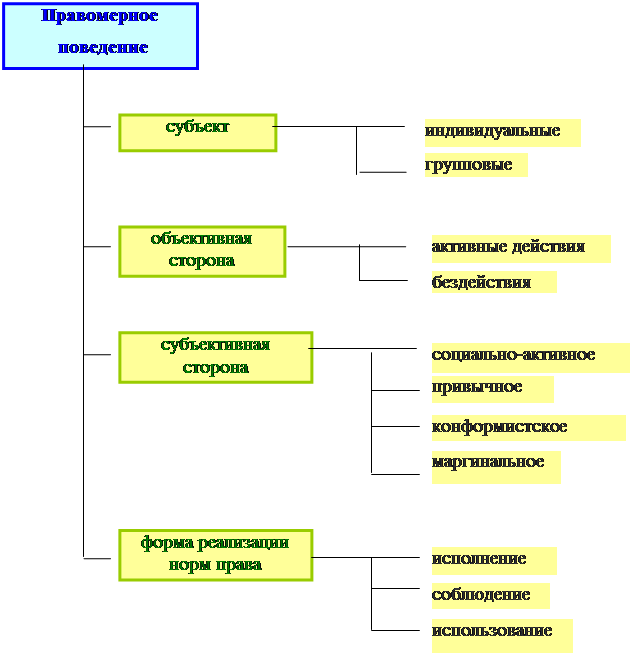 Правомерное поведение – это следование праву в целях достижения социально-полезного результата, это соответствие поведения предписаниям норм права, т.е. субъективным правам и субъективным юридическим обязанностям, возникающим на их основе.