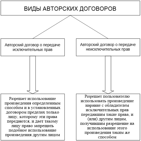 Следующим основанием классификации авторских договоров является передача авторских прав: исключительных и неисключительных.