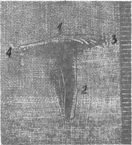 Рис. 2 . Колото-резаное повреждение от действия однолезвийного клинка:1-основной разрез; 2-дополнительный разрез; 3-обушковый конец Т-образной формы; 4-лезвийный конец.