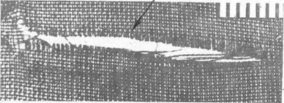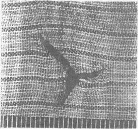 Иногда место удара на ткани обнаруживается только по изменению расстояния между нитями основы.
