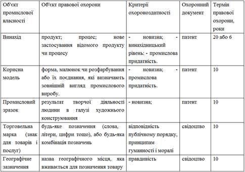 Правова охорона інших об'єктів промислової власності в принципі здійснюється за схемою, що наведена на рис. 4 з тими чи іншими особливостями. Основні характеристики щодо правової охорони цих об'єктів наведені в табл. 1.