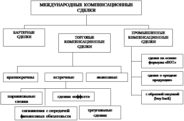 Операции встречной торговли весьма разнообразны и на практике постоянно возникают их новые формы. Эксперты ООН подразделяют международные компенсационные сделки на три основные группы: бартерные сделки, торговые компенсационные сделки, промышленные компенсационные сделки.