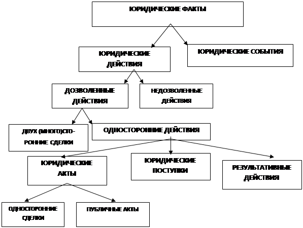 Отечественное законодательство, как и ранее, не знает специальной части или раздела, посвященного юридическим фактам. Действующий Гражданский кодекс РФ лишь иногда объединяет некоторые виды юридических фактов в статьях, посвященных основаниям возникновения гражданских прав и обязанностей (ст. 8), сделкам (ст. 153), основаниям прекращения права собственности (ст. 235), основаниям возникновения обязательств (п. 2 ст. 307), и в некоторых других. Такое положение, вероятно, и служит объяснением того, что до сих пор рассмотрение проблем юридических фактов обычно ведется лишь применительно к отдельным их видам, что не может быть признано правильным.