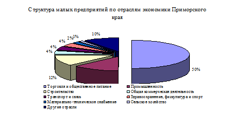 Отраслевая структура за последние годы существенно не изменилась, по-прежнему в сфере торговли и общественного питания занято 50 процентов малых предприятий и 75 процентов индивидуальных предпринимателей. В свою очередь изучая в целом число хозяйствующих субъектов края занятых в торговле можно сделать вывод, что из всего числа субъектов более 90 % приходится именно на малые предприятия и индивидуальных предпринимателей.