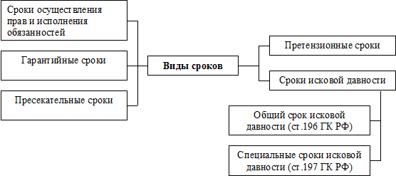 Сроки могут устанавливаться законом, причем такие сроки нельзя изменить соглашением сторон и договором. Важное значение имеет деление на сроки осуществления гражданских прав, сроки исполнения обязанностей и сроки защиты гражданских прав. К срокам осуществления гражданских прав относятся сроки, в течение которых управомоченный субъект может сам реализовать принадлежащее ему право либо потребовать совершения определенных действий от обязанного лица. Сроки осуществления гражданских прав, в свою очередь, делятся на сроки существования гражданских прав, пресекательные, претензионные, сроки годности и др.