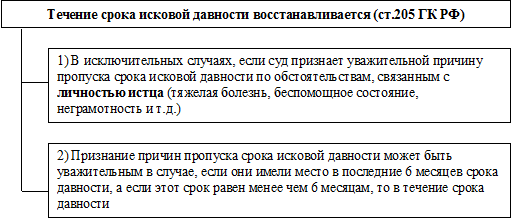 В исключительных случаях, когда суд признает уважительной причину пропуска срока исковой давности по обстоятельствам, связанным с личностью истца (тяжелая болезнь, беспомощное состояние, неграмотность и т.п.), нарушенное право гражданина подлежит защите. Причины пропуска срока исковой давности могут признаваться уважительными, если они имели место в последние шесть месяцев срока давности, а если этот срок равен шести месяцам или менее шести месяцев - в течение срока давности.