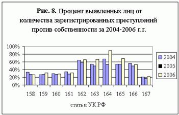 Рис. 2 "Процент выявленных лиц от количества зарегистрированных преступлений против собственности за 2004-2006 г.г."