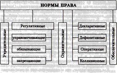 2. По социальному назначению и роли в правовой системе: нормы можно подразделить: на учредительные (нормы-принципы), регулятивные (нормы — правила поведения), охранительные (нормы — стражи порядка), обеспечительные (нормы-гарантии), декларативные (нормы-объявления), дефинитивные (нормы-определения), коллизионные (нормы-арбитры), оперативные (нормы-инструменты) (см. схему на с. 277).