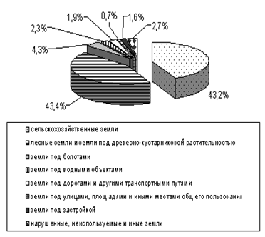 Согласно статистическим данным Государственного земельного кадастра Республики Беларусь общий земельный фонд страны по состоянию на 1 января 2009 г. составлял 20759,8 тыс.га. Структура земельного фонда по видам земель отражена на рисунке (Приложение А). В структуре земельного фонда в 2008 г. по сравнению с 2007 г. существенных изменений не произошло. Сохранилась положительная направленность в динамике площади лесных земель и земель под древесно-кустарниковой растительностью. В то же время площадь сельскохозяйственных земель продолжала планомерно сокращаться.