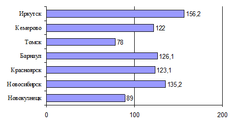 [9] Расчет производился по данным кн.: Итоги социально-экономического развития г. Иркутска за 2006 г. / Инф.-справ. издание.–Иркутск: изд-во «Облмашинформ», 2007.–104 с. и информационных материалов официального сайта Сибирского официального округа http://www.sibfo.ru
