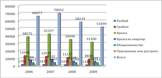 Изучение состояния преступности связанных с хищением в Иркутской области за период с 2006 по 2009 гг. показало, что за указанные годы совершено хищений: в 2006 – 71147; в 2007 – 74685; в 2008 – 62694; в 2009 – 56025 (см. приложение 1).[1]