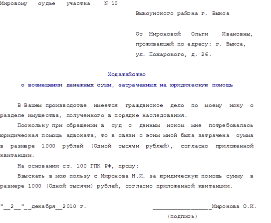 Так например в Президиум Московского областного суда 1августа 2007 года обратился Б. с заявлением о распределении судебных расходов— взыскании с ответчика 25000рублей в счет компенсации расходов представительских услуг, 440рублей за оформление доверенностей, 152рублей 50копеек за получение в банках сведений о ставке рефинансирования ЦБ РФ. А. также обратился в суд с заявлением о распределении судебных расходов— взыскании с Б. расходов на услуги представителя в сумме 42017рублей 50копеек и взыскании компенсации за потерю времени в сумме 20000рублей.