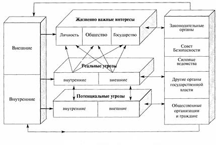 При этом следует различать систему национальной безопасности и систему обеспечения национальной безопасности. Первая - функциональная система, отражающая процессы взаимодействия интересов и угроз, вторая - организационная система органов, сил, средств, различных организаций, призванных решать задачи по обеспечению национальной безопасности.