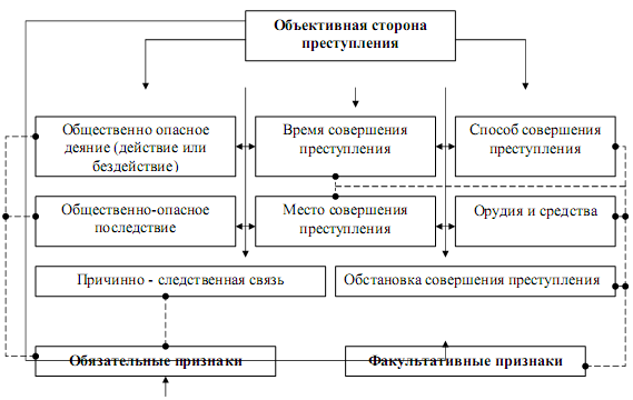 1) Является одним из элементов состава преступления, поэтому неустановление в конкретном деянии признаков объективной стороны преступления исключает уголовную ответственность.