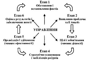 Можна вважати, що цей ряд складається із шести етапів.1) Як відомо, системний аналіз передбачає послідовний поділ процесу на підпроцеси. Численність підпроцесів, звичайно, вибирає автор, що проектує систему управління. Один проектант може виділити п'ять основних етапів формування рішень, у той час коли інший надає перевагу десяти [4 ст.43 с.]. На нашу думку, доцільно використовувати саме шість етапів. Ці етапи надалі будуть розглядатися детальніше, але, щоб охарактеризувати процес прийняття ефективного управлінського рішення, доцільно їх перерахувати: