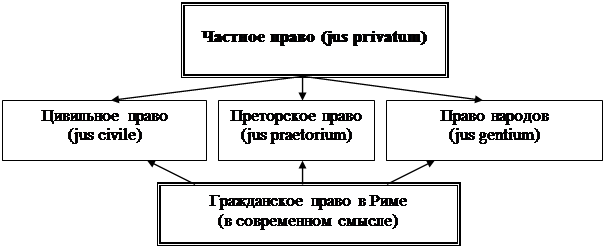 Таким образом, гражданскому праву в Риме (в современном смысле) более или менее соответствовала совокупность всех трех названных систем – цивильного права, права народов и преторского права. В качестве единого термина для всей этой совокупности более подходящим является jusprivatum (частное право).