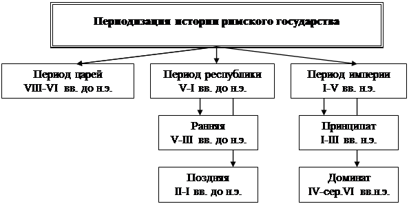 В истории римского государства различают следующие периоды[3] (см. рис. 3): период царей – VIII-VI вв. до н.э., период республики – V-I вв. до н.э. (ранняя республика – V-III вв. до н.э. и поздняя – II-I века до н.э.); период империи – I-V вв. н.э. (в свою очередь, империю подразделяют на принципат – I-III века н.э. и доминат – IV-середина VI века н.э.). История государства древнего Рима имела свою периодизацию, а история римского права - свою, не всегда совпадавшую с периодизацией римского государства.