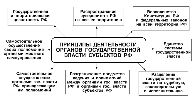Важнейшим принципом системы государственных органов Российской Федерации является принцип разграничения предметов ведения и полномочий между органами государственной власти РФ и органами государственной власти субъектов РФ. Как уже отмечалось, Конституция РФ определяет компетенцию самой Федерации и совместную компетенцию Федерации и ее субъектов. Так называемые "остаточные" полномочия входят в предмет ведения исключительно субъектов Федерации и в данном случае субъекты Федерации обладают всей полнотой государственной власти. Однако, в вопросах распределения компетенции между самой Федерацией и ее субъектами остается много нерешенных проблем. В частности, нет четкого распределения полномочий в системе органов исполнительной власти РФ и ее субъектов, распределения полномочий в других областях государственной жизни.