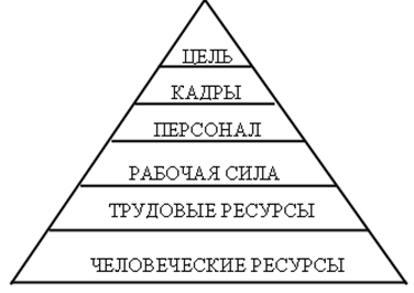 Трудовые ресурсы и рабочая сила выступают обычно в качестве объекта государственного управления, а кадры и персонал – отраслевого и фирменного управления человеческими ресурсами. Иными словами, понятие «кадры» и «персонал» больше относятся к индивидуально-психологическому и социально-психологическому аспектам изучения человеческих ресурсов (уровень личности и уровень коллектива), понятие же «рабочая сила» и «трудовые ресурсы» больше характеризуются социологические и социально-экономические аспекты (уровень общества и его подструктур).