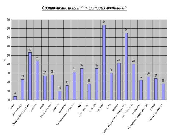 Таким образом, респонденты, по всей вероятности, более осмысливают белый цвет, т.к в обыденном сознании это всегда светлое; красный цвет, возможно, еще не исчез из их сознания, ибо чуть более 15 лет назад он был традиционно государственным цветом. Что же произошло с синим цветом? Почему он в сознании респондентов не ассоциируется с предлагаемыми понятиями? Да потому, что все они - понятия религиозные и, конечно же, сознанию современной молодежи более чужды.