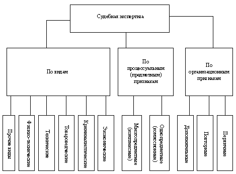 Экспертизы классифицируются по организационным, процессуальным (предметным) признакам и видам (рис.1). По организационным признакам они делятся на первичные, назначаемые по конкретному делу впервые, и повторные, назначаемые по одному и тому же делу повторно. Повторная экспертиза назначается в случае, если в заключении эксперта нет достаточно полных ответов на вопросы, поставленные органами суда и следствия. Дополнительной является экспертиза, которая назначается в зависимости от ситуации, возникшей в ходе расследования и вызвавшей необходимость решения экспертизой дополнительных вопросов или вследствие неполноты исследования первичной экспертизой поставленных вопросов, неконкретности и нечеткости ответов на отдельные из них.