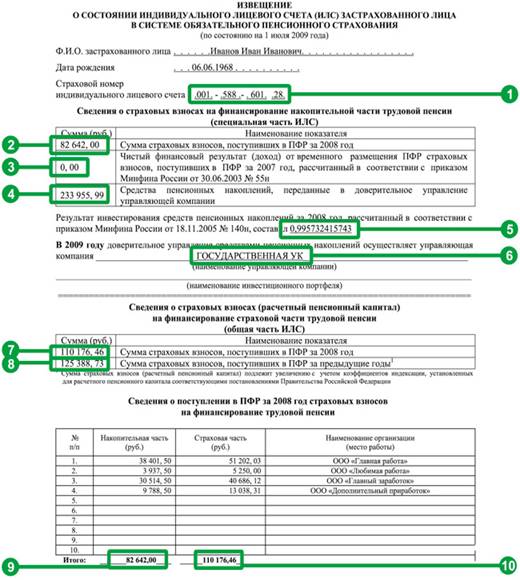 1 - Номер индивидуального лицевого счета в системе обязательного пенсионного страхования; 2 - Информация о страховых взносах, поступивших на финансирование накопительной части трудовой пенсии. Эту сумму перечислил работодатель (или суммарно работодатели) в 2008 году; 3 - Эта сумма образовалась на счете благодаря тому, что взносы, которые поступили в ПФР в течение 2007 года, ПФР временно вкладывал в государственные ценные бумаги; 4 - Эта сумма накопилась на счете за 2002-2007 годы; 5 - В этой строке указывается, с какой эффективностью инвестировались пенсионные накопления в течение 2008г; 5 - Указана выбранная УК или НГФ, который управляет вашими пенсионными накоплениями; 7, 8 - Сведения о страховых взносах, которые поступили на формирование страховой части трудовой пенсии: 9, 10 - Суммы страховых взносов, поступивших на формирование накопительной и страховой частей будущей трудовой пенсии по каждому работодателю.