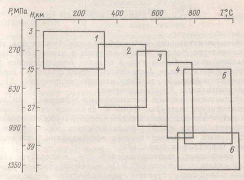 1-6 – фации: 1 – цеолитовая, 2 – зеленосланцевая, 3 – амфиболовая, 4 – глаукофановая, 5 – гранулитовая, 6 - эклогитовая
