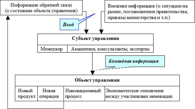 Инновационный менеджмент – это определенная система управления. Как система он состоит из двух подсистем: управляющей (субъект управления) и управляемой (объект управления). Связь субъекта управления с объектом управления осуществляется посредством движения информации. Это движение информации представляет собой процесс управления, и означает процесс сбора, хранения, переработки, передачи информации, контроля за ее движением и оценку результативности ее использования для воздействия со стороны субъекта управления на объект управления. Субъектом управления в инновационном менеджменте может быть работник или группа работников (специалистов по маркетингу, по финансам и т.п.), которые посредством различных приемов и способов управленческого воздействия осуществляют целенаправленное функционирование объекта управления. Объектом управления в инновационном менеджменте являются инновации (продукты и операции), инновационный процесс и экономические отношения между участниками рынка инноваций (продуцентов, продавцов, покупателей).