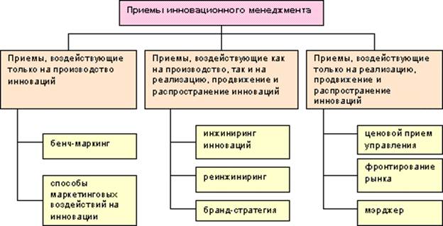 Приемы имеют направления действия в области производства и продажи нововведения. Эти направления определяются самой структурой инновационного процесса, подразделяют приемы инновационного менеджмента на следующие группы: