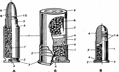 Кольцевого воспламенения (В): 1 - корпус гильзы, 2 - кармашек, 3 - фланец, 4 - прессованный порох, 5 - метательный снаряд, 6 – пуля; 7,8 - накатка и канавка.
