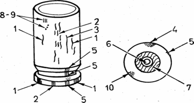 Нарезного оружия (А): 1 - корпус гильзы, 2 - кольцевая проточка, 3 - фланец, 4 - капсюль, 5 - дульце, 6 - скат, 7 - метательный заряд, 8 - сердечник пули, 9 - оболочка пули, 10 - канавка.
