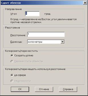 Копировать/перемещать используя расстояние - этот раздел включает две настройки, выбор которых зависит от того, какая проекция у исходной карты. Если Карта в проекции Широта/Долгота, то MapInfo Professional может использовать только метод расчета расстояния На сфере. Если Вы работаете с план-схемой или с картографическими проекциями, то MapInfo Professional может использовать только метод расчета расстояний На плоскости.